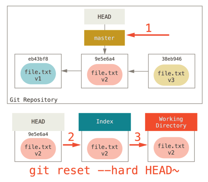 Git에는 데이터를 실제로 삭제하는 방법이 별로 없는데 그 방법 중에 하나이다. reset 명령을 어떻게 사용하더라도 간단히 결과를 되돌릴 수 있지만 --hard 옵션은 되돌리는 것이 불가능하다. 이 옵션은 워킹 디렉토리의 파일까지 강제로 덮어쓴다.